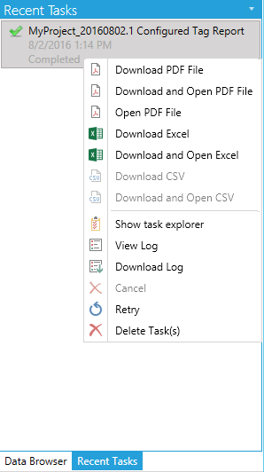 You can right-click on the completed Configured Tags Report task in the Recent Tasks panel for additional options, including Download PDF File, Download and Open PDF File, Open PDF File, Download Excel, Download and Open Excel, Download CSV, Download and Open CSV, Show task explorer, View Log, Download Log, Cancel, Retry and Delete Task(s). [Note: The same right-click options are available when viewing the task within the Task Explorer.]