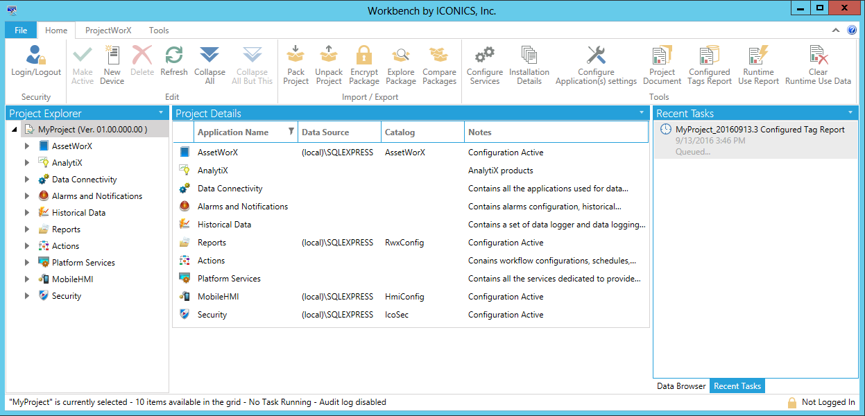 The Configured Tags Report Wizard then proceeds to create your requested report. Reports are generated asynchronously on the server. You will see the report's status appear in the Recent Tasks panel on the right side of the Workbench, as highlighted below.