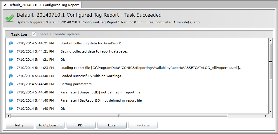 Click View Log to see the log for the Configured Tag task (whether running or completed), as shown below. You also have the option of saving the log to the clipboard or as a PDF document.