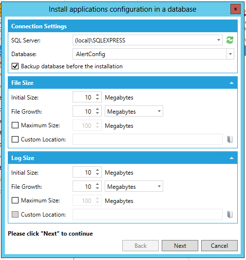 You can opt to expand the File Size section of the window and then set the database's Initial Size (in megabytes), File Growth (in either megabytes or percentage) and (optionally) Maximum Size (in megabytes). In addition, you can also set a Custom Location for the database. If selected, you can then enter a location in the text entry field or click on the