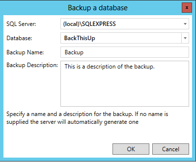 - Click on Backup Database to create a backup of a selected database. The Backup a database window, shown below, appears.