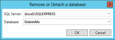 - Click on Delete Database to delete a database from the selected SQL server. The Remove or Detach a database window, shown below, appear.