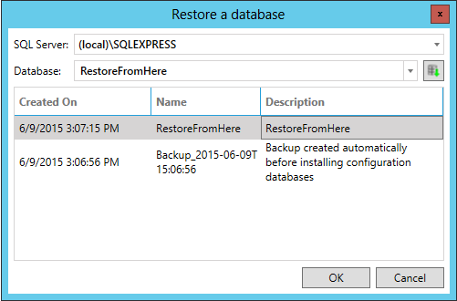 - Use the pulldown menus to select the SQL Server and the Database you wish to restore.