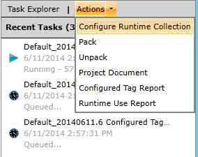 The Actions button, shown below, works as a pulldown menu, allowing you to select integrated actions including Configure Runtime Collection, Pack, Unpack, Project Document, Configured Tag Report and Runtime Use Report.