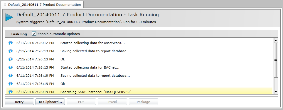 The Log window provides an indicator of which report was generated and how long the generation ran. It also lists the tasks/action. You can elect to Enable automatic updates by clicking on the checkbox.
