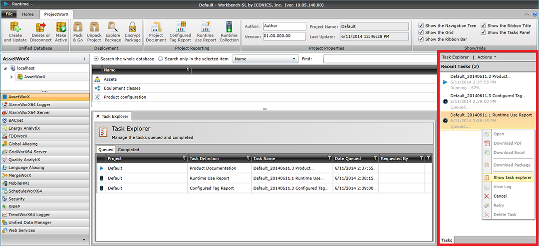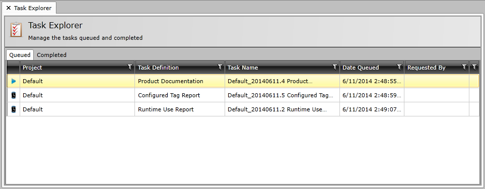 Once you have generated a report via the Project Document, Configured Tag Report or Runtime Use Report, you can see its status in the Task Panel in the right side of the the Workbench window, as shown above.