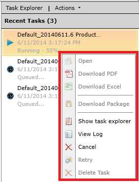 In the Task Explorer, in both the Queued and Completed tabs, you can right-click an individual report and perform the same actions as you can directly in the Task Panel. See Right-Click Options below.