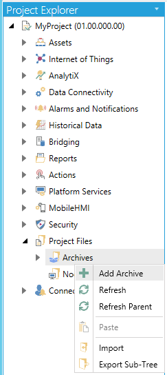 Right-click on the Archives node and select Add Archive from the pulldown menu, as shown below.
