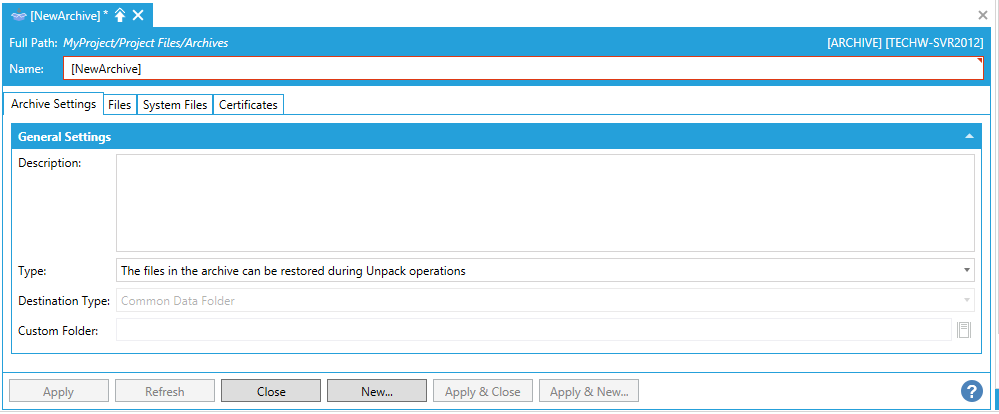 This opens the Archive properties in the Workbench, shown below. Enter a Name for the archive in the text entry field.