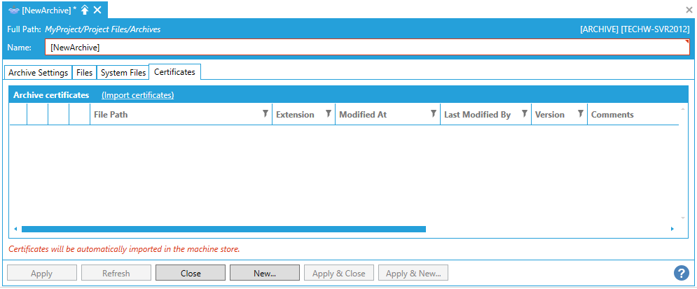 Once you have completed your Archive settings, click on Apply then Close. Your newly created Archive (settings) will appear in the Project Explorer in the Workbench.