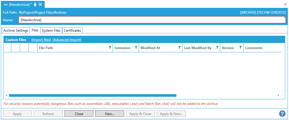 Note: For security reasons, potentially dangerous files such as assemblies (.dll), executables (.exe), and batch files (.bat) will not be added to the archive.