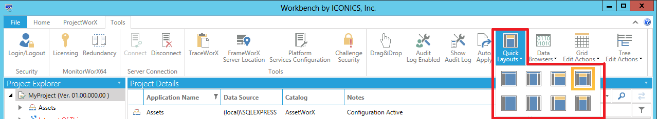 Once selected, changes to the existing Workbench layout are immediate. These changes can be reverted by selecting the prior layout through the Quick Layouts button.
