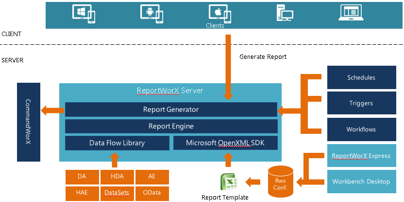 Report Execution is performed when the server retrieves the template from the configuration. The OpenXML SDK is used to generate the reports. (Note that Microsoft Excel is not required on the server side.) The generated report is saved in a runtime database, which is not tied to the configuration database.