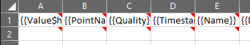 Select OK. Cells A1 through J2 should now appear with some text and notes (red triangles) that indicate it is mapped to a historical tag.