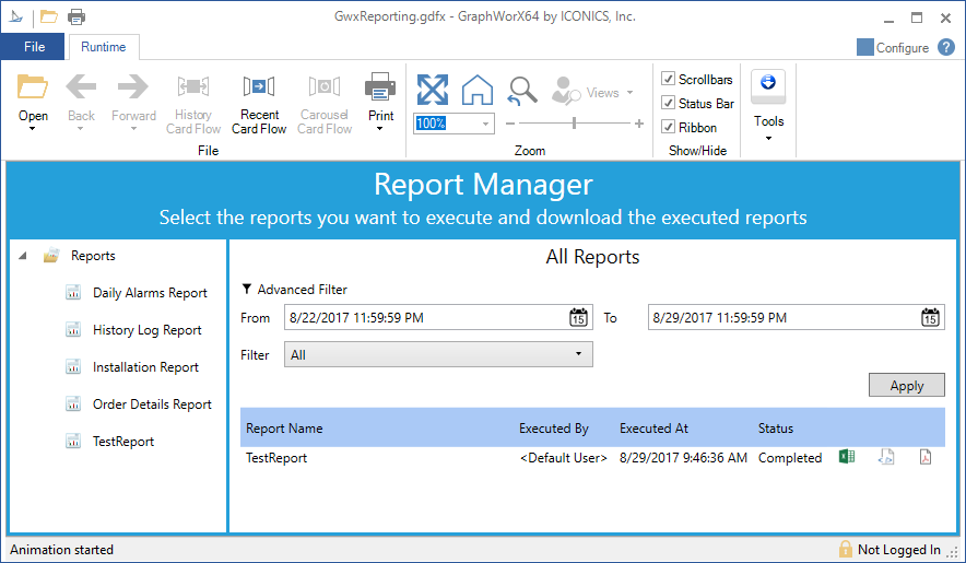 Go into runtime. This display should work exactly as the prebuilt Reporting display described in the previous section. (Follow the steps in that section to execute and download a report.)