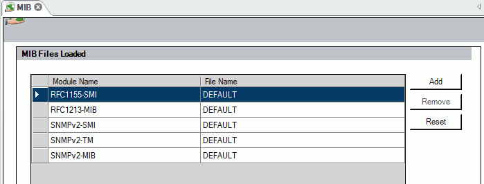 Click the Add button to browse for your desired MIB (*.mib) files. Click Remove to delete any listed files from an existing list. Click Reset to reset the MIB database and delete all files and OIDs (only default MIBs will be loaded in the database). Once you have completed adding MIB Files, click the Apply button to save your changes. To exit, click the X in the MIB folder tab at the top of the screen.