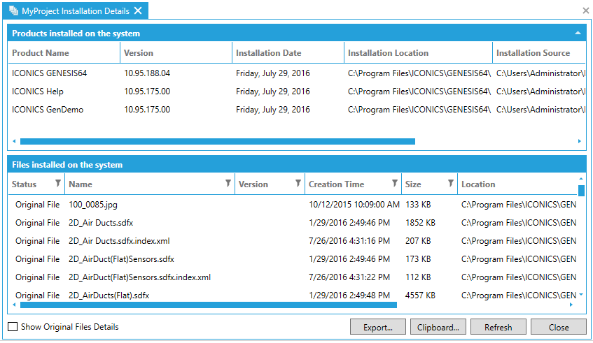 The Files installed on the system section shows information related to files associated with the installed ICONICS products. This information includes Status, Name, Version, Creation Time, Size and Location. These fields cannot be edited.