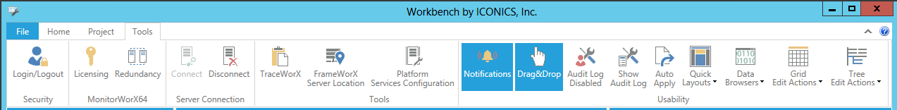 The Tools ribbon in the Workbench contains multiple settings for properties throughout the GENESIS64, AnalytiX or Hyper Historian suites, as well as within the Workbench itself.