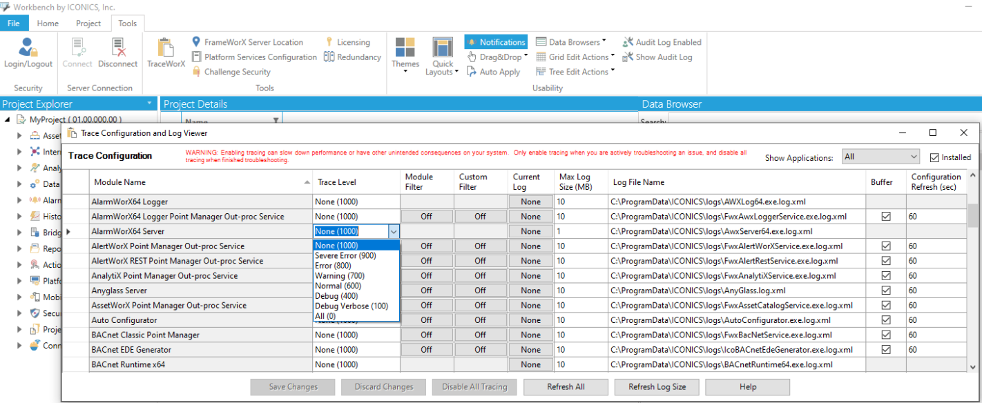 The Workbench contains a diagnostics tool called TraceWorX. It is designed for system integrators, OEMs and customers who want tools for their own troubleshooting and diagnostics.