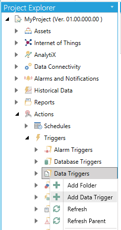 Open the Workbench and expand the Actions node and then the Triggers node. Right-click on the Data Triggers node then click on Add Data Trigger, as shown below.