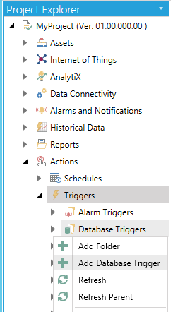 Open the Workbench and expand the Actions node and then the Triggers node. Right-click on the Database Triggers node then click on Add Database Trigger, as shown below.