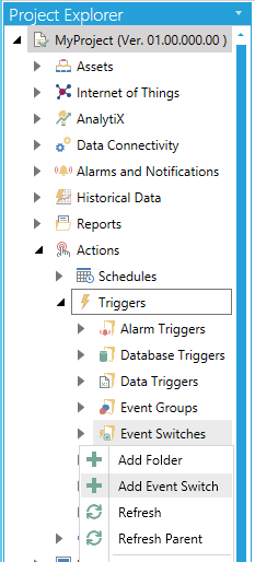 Open the Workbench and expand the Actions node and then the Triggers node. Right-click on the Event Switches node then click on Add Event Switch, as shown below.
