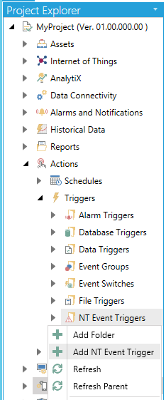 Open the Workbench and expand the Actions node and then the Triggers node. Right-click on the NT Event Triggers node then click on Add NT Event Trigger, as shown below.