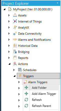 Open the Workbench and expand your project in the Project Explorer and then the Actions node and then the Triggers node. Right-click on your selected Trigger type (in the example below, we are creating an Alarm Triggers folder) and click on Add Folder. [Note, in installations other than GENESIS64 (AnalytiX, etc.) the Triggers node may be nested higher in the Project Explorer.]
