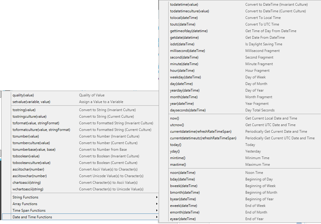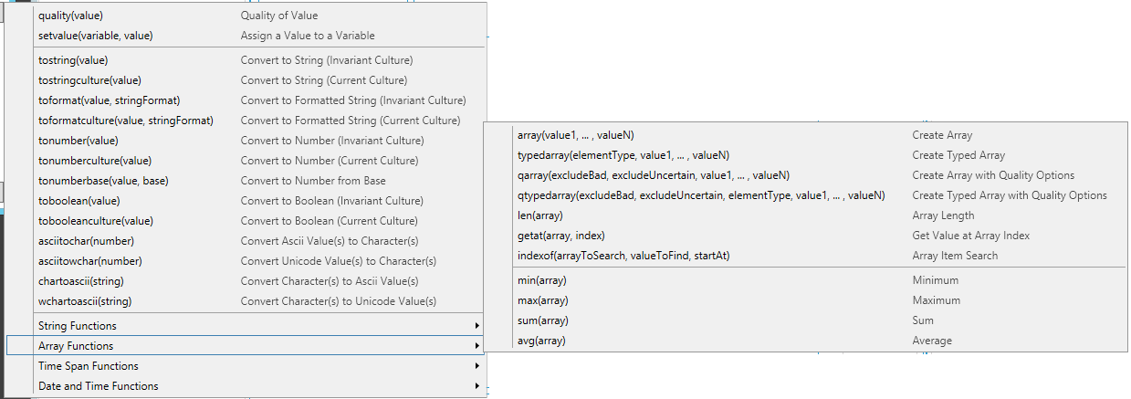 Note: For detailed information about the differences between local and global expressions, refer to Expressions in the Data Browser. Note: If you are creating calculated tags in Hyper Historian, also refer to the functions described in the Performance Calculation Functions topic in Hyper Historian. |