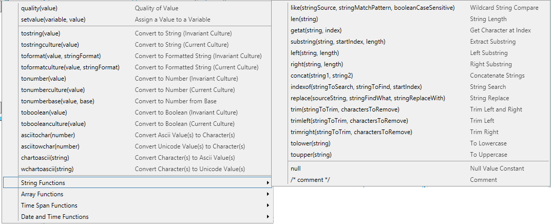 You can either type your expressions directly into the text box of the Edit Expression dialog box, or you can use the symbols and functions provided that help you use the proper string syntax when writing expressions. There are certain options you can use when writing expressions; they include String Expressions, String Comparison, Data type Conversion and Point Extension Syntax. The Expression Editor also provides buttons that list available functions to assist you in writing expressions; click on one of the hyperlinks to go do a more detailed discussion: