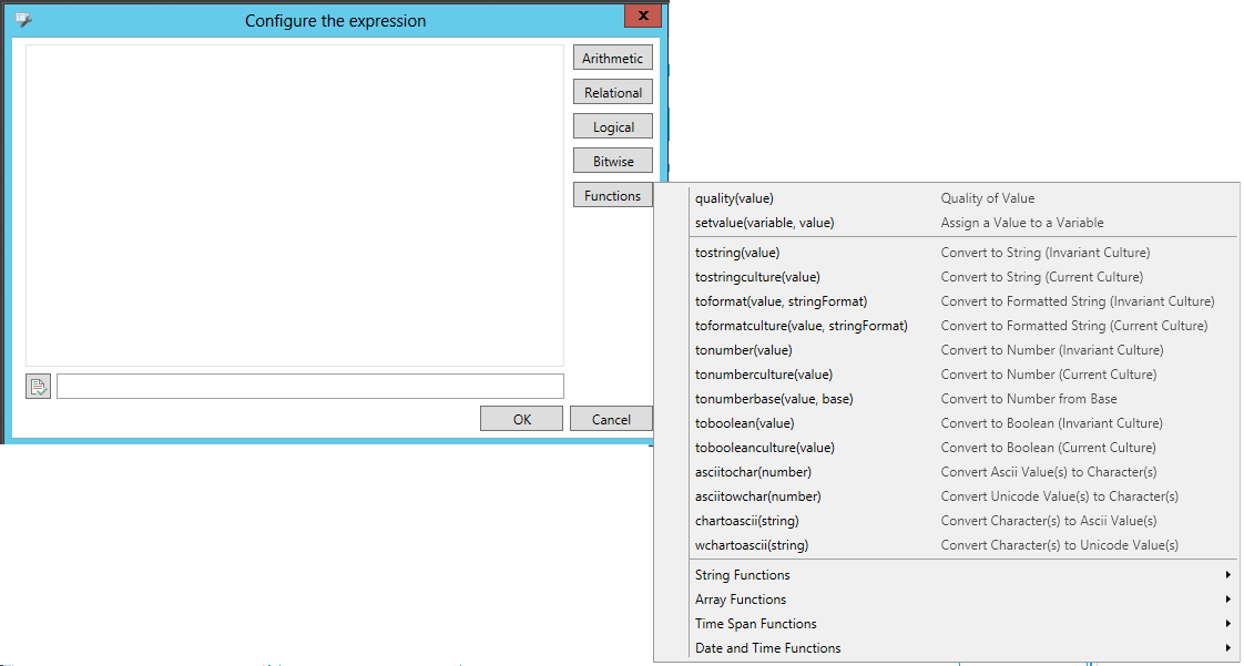 Some of the functions provided in the Expression Editor use parameters of type numeric. When possible, the Expression Editor automatically converts the string into a number. For example, the string “20” can automatically be converted to the number 20.