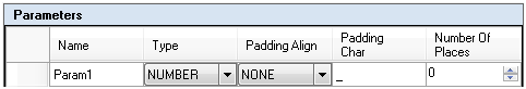 In the Parameters section, enter any parameters desired, assigning them a name, type (number or string), padding alignment (none, left or right), the characters used to pad with (for example, 0s), and the number of places that the parameter will be padded up to (optional). Parameters are explained in the Parameters section below.