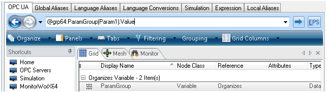 Grouping allows you to write a single variant value to a group of data tags. Each group of tags is represented by a group data tag. Group data tags are organized in a tree structure of folders and group items. Since each group is represented as a data tag, a group data tag may also be included in other groups. Group values are written synchronously to target OPC servers.