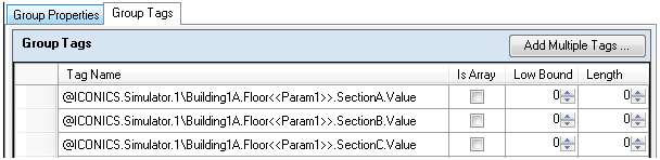 Back in the Group Tags tab, for each tag you add, define whether the tag is an Array of values, limit the Low value, and set the Length of the value returned (optional).
