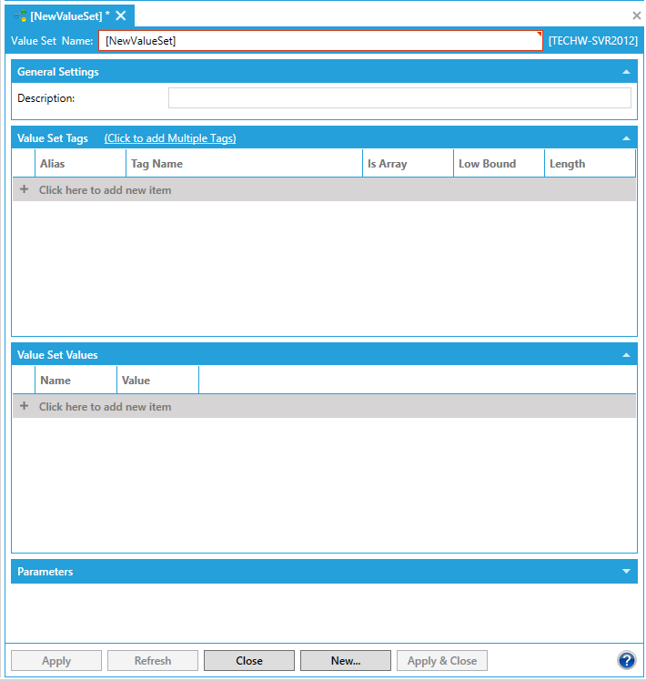 In the ValueSet Tags section, you can assign a tag to a valueset. Fill in the Alias for the tag, enter the Tag Name using the Unified Data Browser, define whether the tag is an Array of values, limit the Low value, and set the Length of the value returned (optional). A ValueSet data tag can contain an unlimited number of data tags. In the ValueSet Tags tab, specify one or more tags that will be included in the ValueSet data tag.