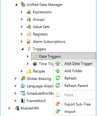 Data triggers are organized in a tree structure of folders and data trigger tags (items). Folders allow organization of data tags into a hierarchical tree structure.