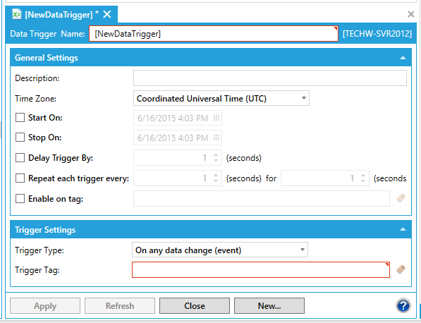 In the Trigger Settings section, select the Trigger Type in the Trigger Type drop-down list. Select from On any data change (event), When data tag changes to FALSE, When data tag changes to TRUE, When data tag is FALSE, and When data tag is TRUE.