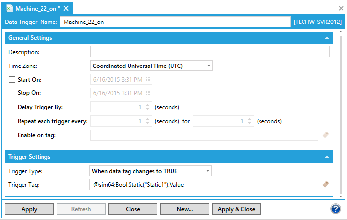A Data Trigger executes an event every time a tag becomes TRUE or FALSE. That event can be sent to a data tag and used by a program to determine whether an action should proceed or not. Lets say that you want to log data in the Hyper Historian , but only when the system of interest (Machine_22) is actually running. You cou,ld create a data trigger that sets a data trigger that sets the data flag to TRUE when the system starts up. In the figure below the Machine_22_on data trigger has its value set to TRUE and has that value sent as an event to a PLC INPUTS.BIT.value tag (here a simulator).