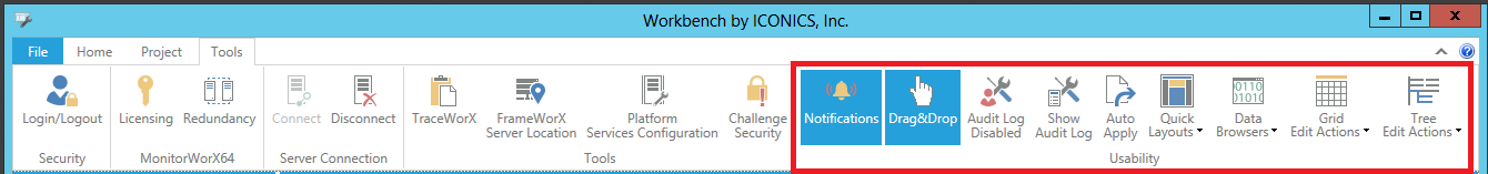 The Usability Section of the Tools Ribbon in the Workbench is comprised of the following items: