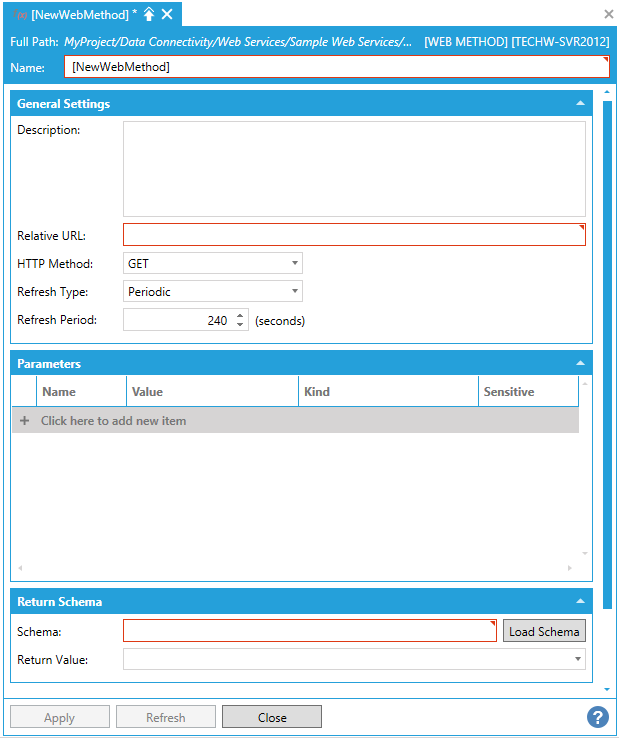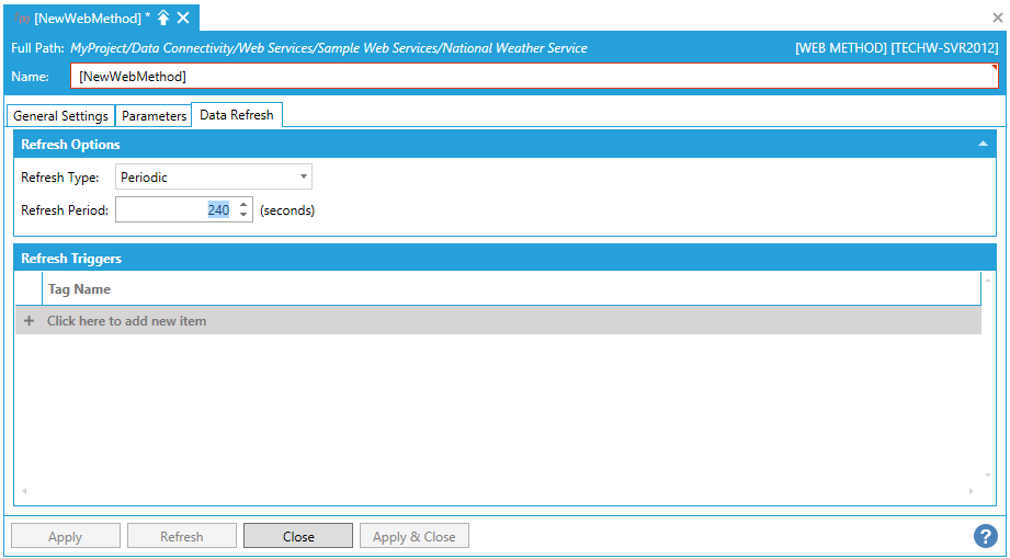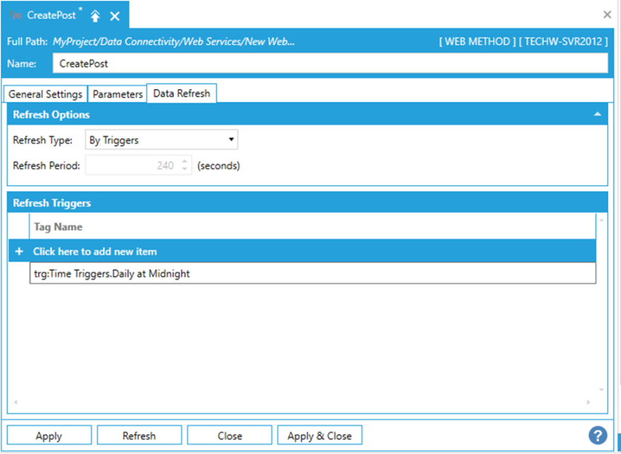 The Data Refresh tab is used to configure refresh behavior for the Web Method.