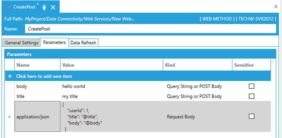 Then, we can proceed to create individual parameters for title and body, with Kind set to Query String or POST Body: