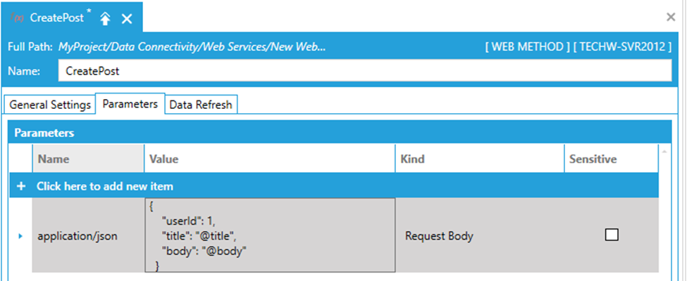 The final result is that in runtime, the Request Body parameter will not be a part of the point name anymore. We will see the title and body parameters instead: