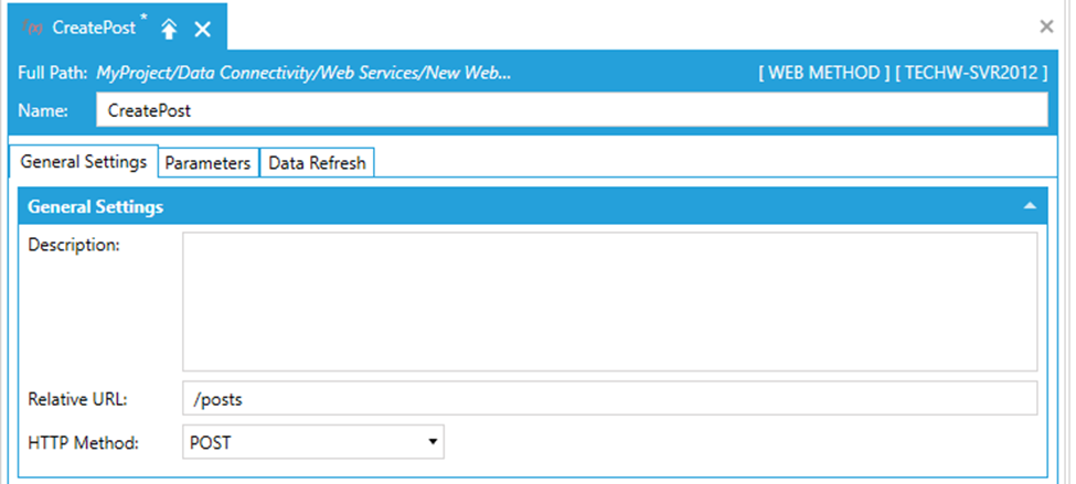 The sub-branches beneath a newly created Web Service (as mentioned in Create a New Web Service - REST) allow you to create a Web Method.