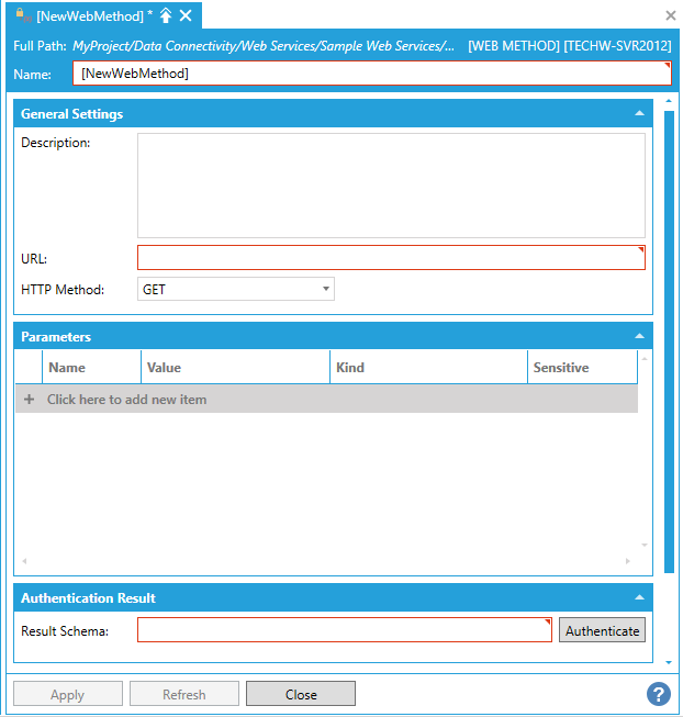 A new form will populate. Fill out this form with the required settings to invoke the JWT authentication method exposed by the server you wish to interact with, and click Authenticate. If the authentication is successful and a JWT could be retrieved, the result will be shown in the Result Schema textbox. This Web Authentication Method will be used later.