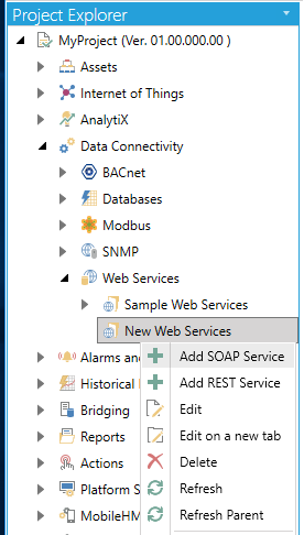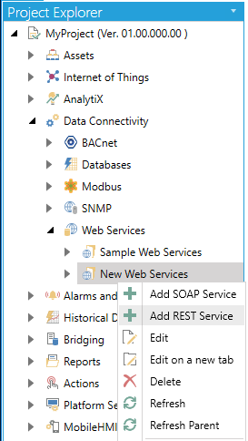 Expand the Web Services provider tree control, then My Web Services. Right-click on a Web Services folder, as shown below, and select Add REST Web Service.