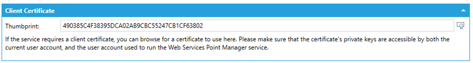 If the server requires a client certificate to be presented with each call, it can be configured in this section. Click the browse button to browse for a certificate installed on the machine: