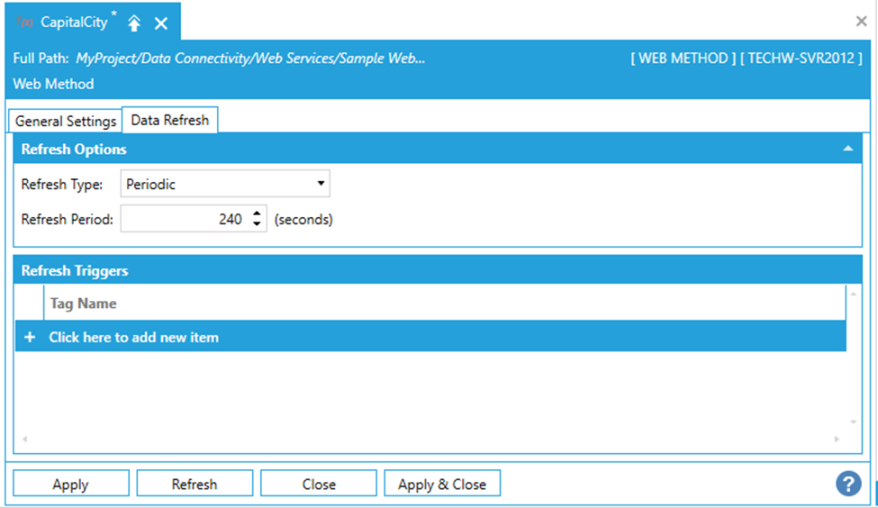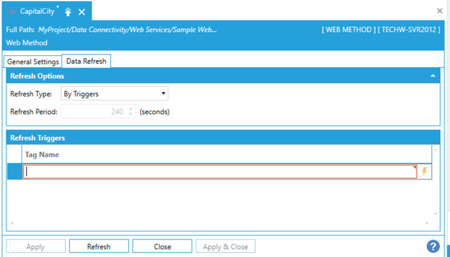 To configure a refresh trigger, select By Triggers in the Refresh Type combo-box, and then click on the Click here to add new item link under Refresh Triggers:
