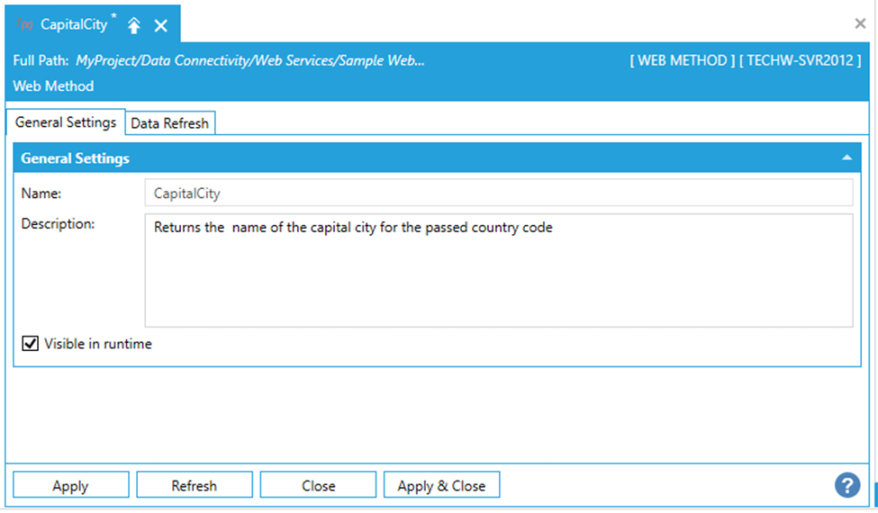 The Visible in runtime checkbox, when unchecked, allows to completely hide and disable access to the Web Method from other applications. This means that the method will not be browsable from the Unified Data Browser and cannot be accessed via the Web Services runtime.