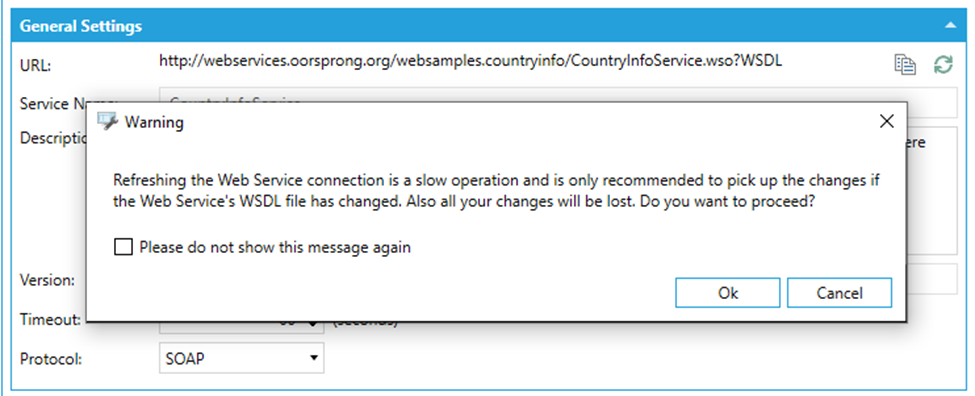 Once the methods have been downloaded, the configuration is cached and assigned a Version number. If the SOAP service is modified, it is necessary to rebuild the configuration to pick up the changes. In order to do so, click on the Refresh icon button next to the URL, which will prompt a confirmation dialog: