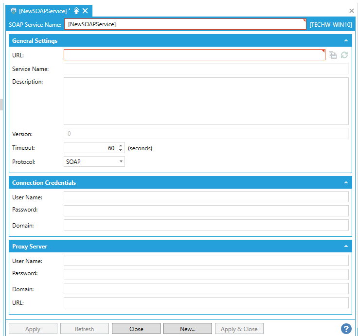 In the General Settings section, you can enter the URL for the SOAP service as well as provide a Service Name, Description, and Version. You can also set a Timeout (in seconds) after which, the attempt to connect to the URL will cease. You can select the Protocol as to how to connect (SOAP, HTTP Get or HTTP Post).
